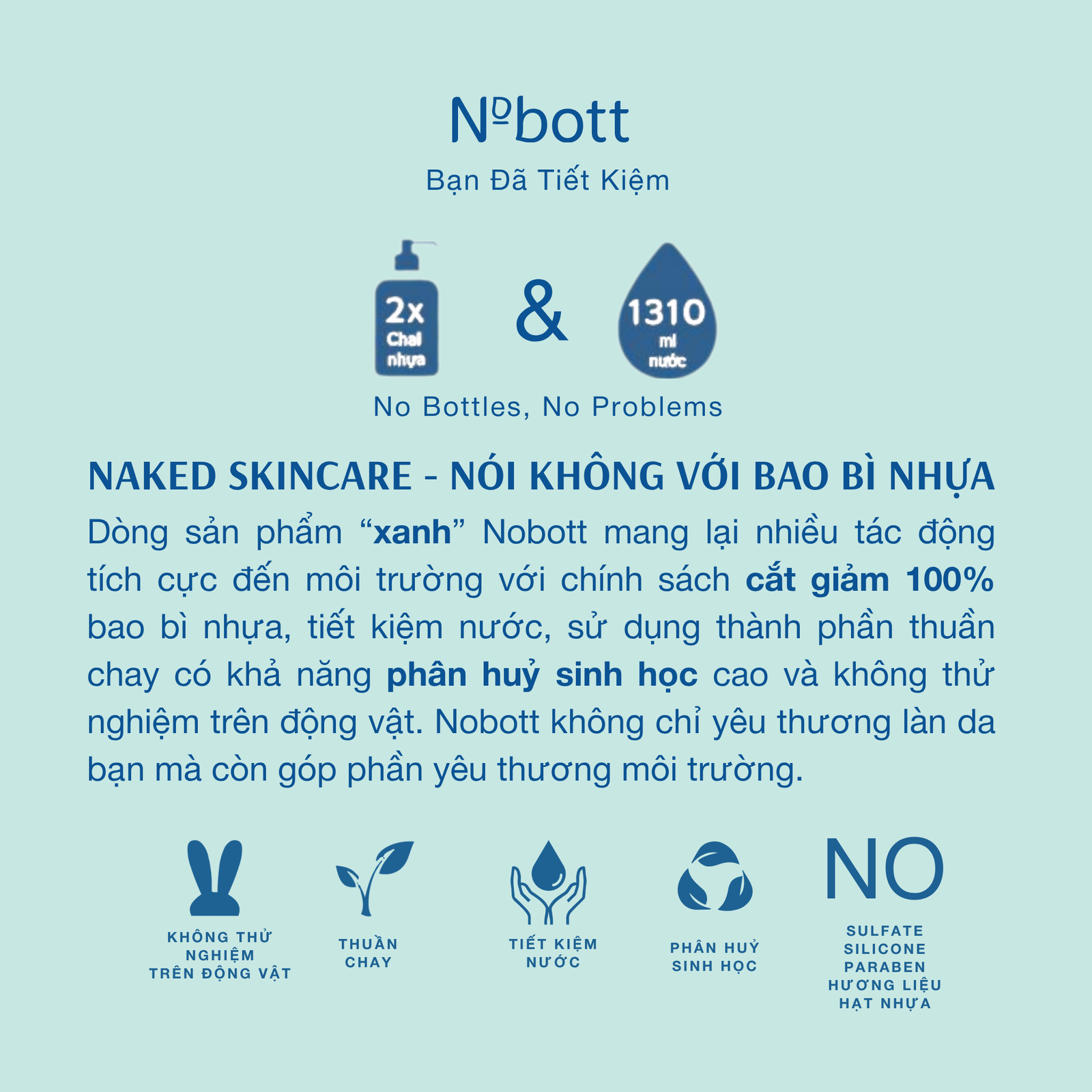 Nobott ở đây nghĩa là “No bottle- No problem”: Không chai lọ cũng không có vấn đề gì mà ngược lại có thể giảm thiểu được rác thải nhựa ra môi trường. Trung bình, mỗi năm Việt Nam thải ra môi trường 3,1 triệu tấn rác thải nhựa, chính vì vậy sử dụng bánh rửa mặt Nobott là sự lựa chọn tốt cho sức khoẻ và làn da của bạn.